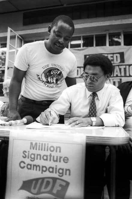 Mosiuoa Patrick Gerald Lekota and anti-apartheid clergy Dr Allen Boesak during their days with the United Democratic Front (UDF), actively engaging in the Million Signature Campaign. Picture Credit: Facebook